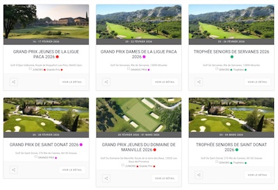 Liguegolf.Provence-Alpes-Côte d’Azur Calendrier des Compétitions Vue Agenda Légende : Championnats de Ligue Classic Mid-Amateurs Grands Prix Juniors Seniors Passer en vue "Grille" Catégorie SENIORS Trophées JUNIORS Grands Prix Mini-Tour U10 GRANDS PRIX Lieu Golf d’Opio-Valbonne Golf de Servanes Golf de Saint Donat Golf du Domaine de Manville Golf de l’Esterel Choisir un moisjanvierfévriermarsavrilmaijuinjuilletaoûtseptembreoctobrenovembredécembreSelect Year2026 Réinitialiser Mensuelle Hebdomadaire Quotidienne Liste décembrejanvier 2026février LUNMARMERJEUVENSAMDIM 293031123456789101112131415161718192021222324252627282930311 Vers la vue Grille